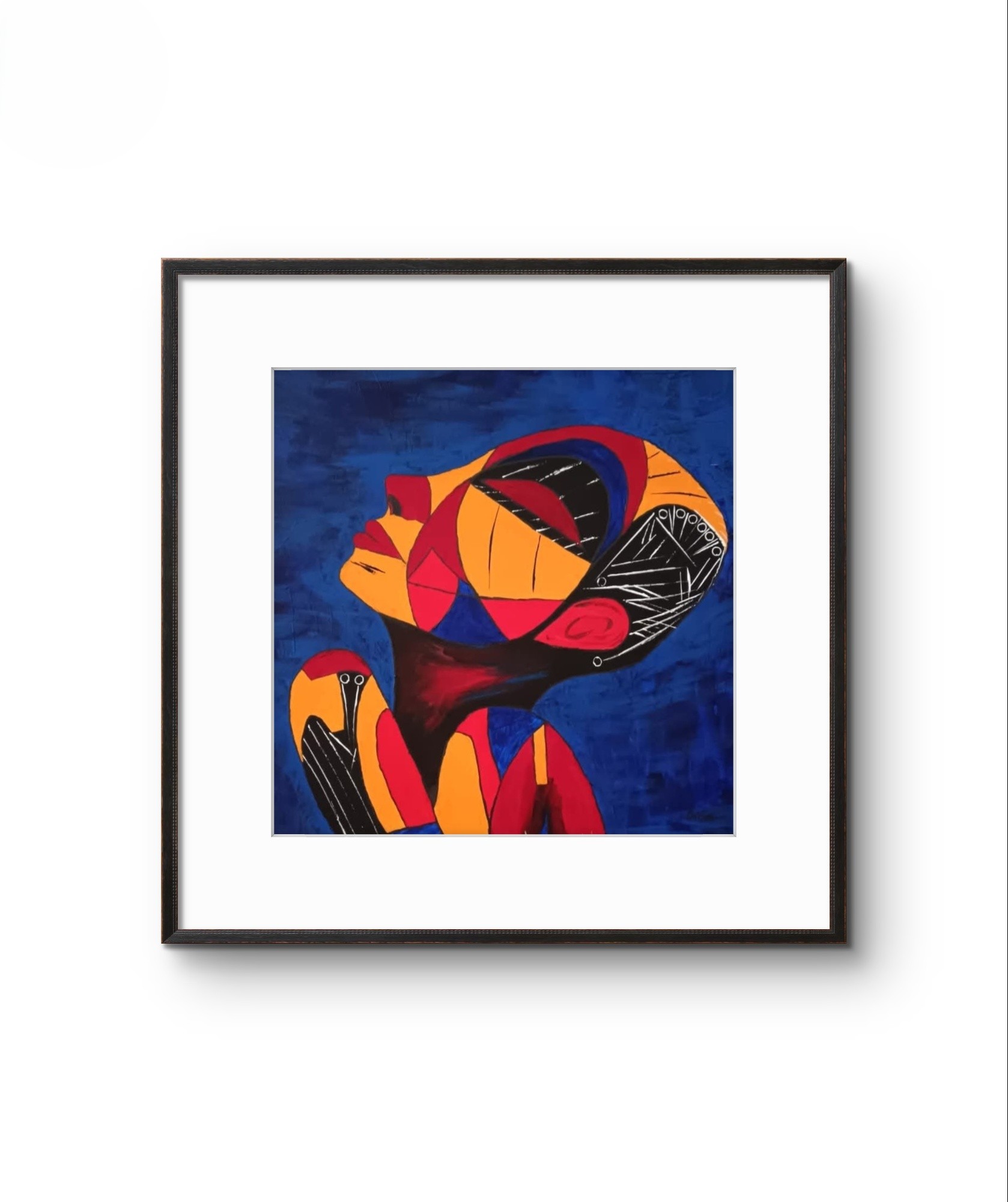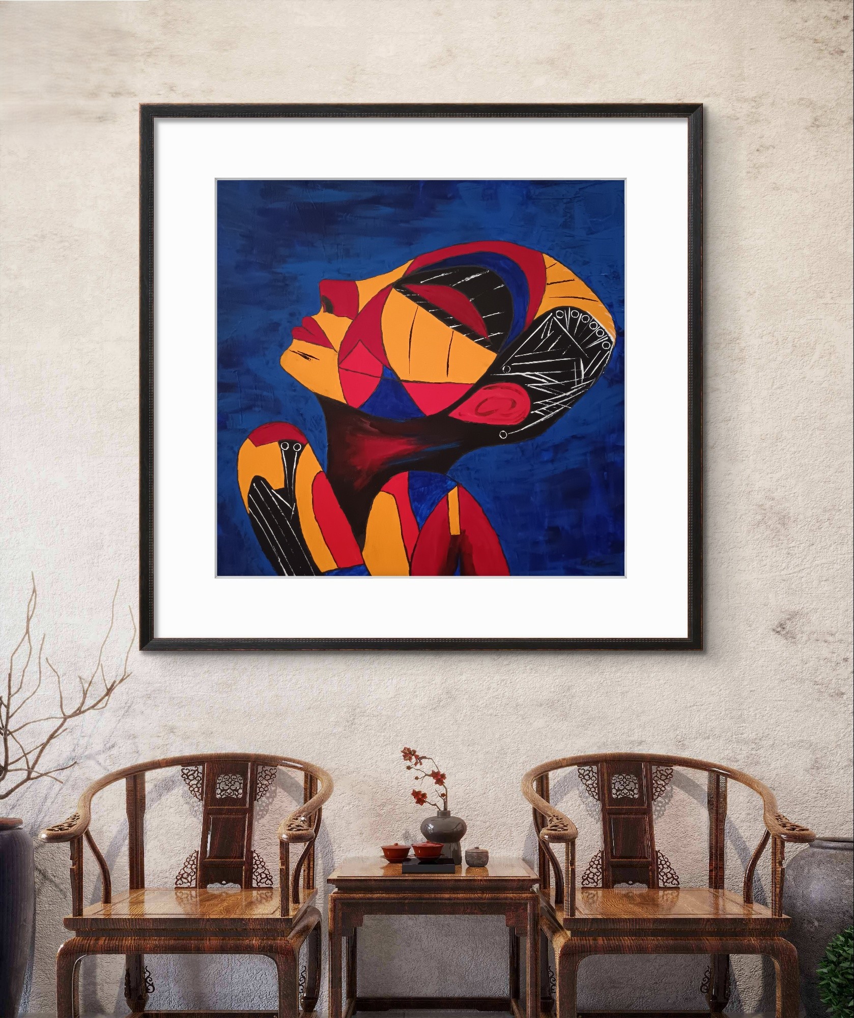 Le visage humain devient territoire. Son profil stylisé, tourné vers le ciel, dégage une force intérieure, presque spirituelle — une élévation silencieuse, une quête intime.
